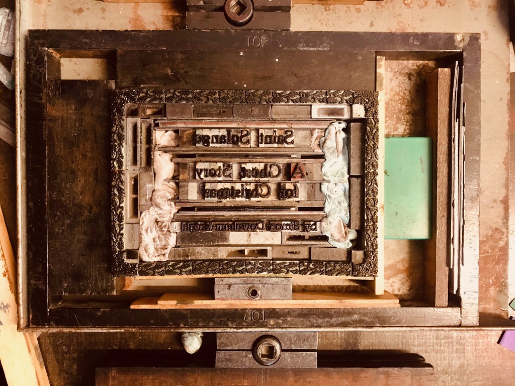 Last week, I celebrated finishing a rough first draft of my upcoming novel Saint Solange, by spending a day at Jo Barnfield’s basement print department in Bath. There we used vintage, antique, moveable type to create the above image as a frontispiece for it. Saint Solange was very much inspired by the scandal at the Haut de la Garenne Children’s Home on Jersey and the ghost stories of M.R. James, Susan Hill and Henry James. It was also inspired by films from the ‘50s, ‘60s and ‘70s that featured children and young people dealing with the difficult world of adults, such as Whistle Down the Wind (1961), Tiger Bay (1959), Sky West and Crooked (1965), and The Railway Children (1970). Children’s films that did not talk down to, or patronise the viewers.